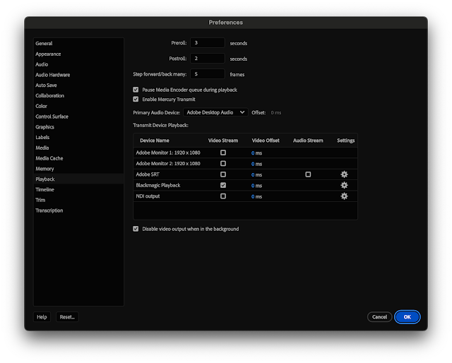 For some reason with Premiere I cannot use Primary Audio Device: Adobe Desktop Audio, and Transmit Device Playback to both Blackmagic and NDI. The output video on the Blackmagic USM3G is frozen. It will update if I jump around in the timeline, but it will not playback in realtime instead displaying a frozen frame.